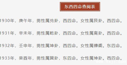 按以上出生年查,西四命忌住东西宅,东西命忌住西四宅。